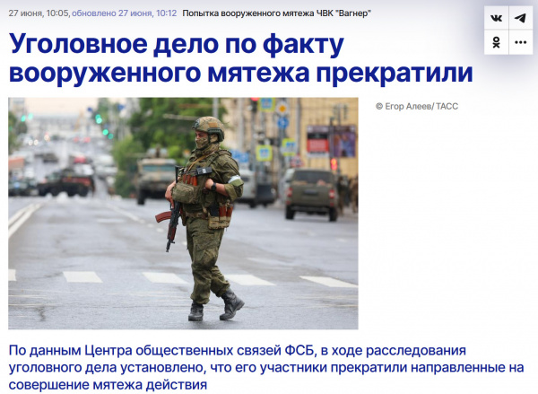 Невыносимо прекрасное. Подняли мятеж, сбили три вертолета и самолет, погибло 13 человек, также при обстрелах колонны вагнеровцев, судя по всему, пострадали мирные жители (точного подтверждения, впрочем, пока нет), из-за этого перерыли кучу дорог, взорвали Воронежскую нефтебазу, чуть не взорвали мост через Оку.