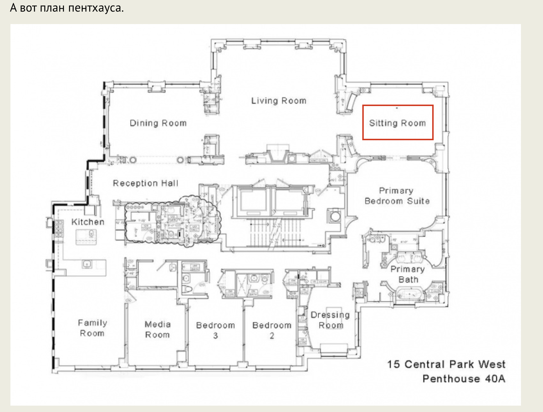 Пентхаус в здании по адресу 15 Central Park West, спроектированный Робертом А.М. Стерном, находится на 40-м этаже с видом на Центральный парк. Этот единственный в своем роде пентхаус площадью 511 кв. м.