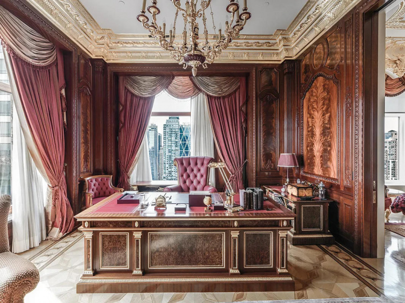 Принадлежал он совладельцу аэропорта "Домодедово" Валерию Когану. Отделка пентхауса, как я понял, делалась по заказу Когана: оникс, яшма, вставки из 24-каратного золота.