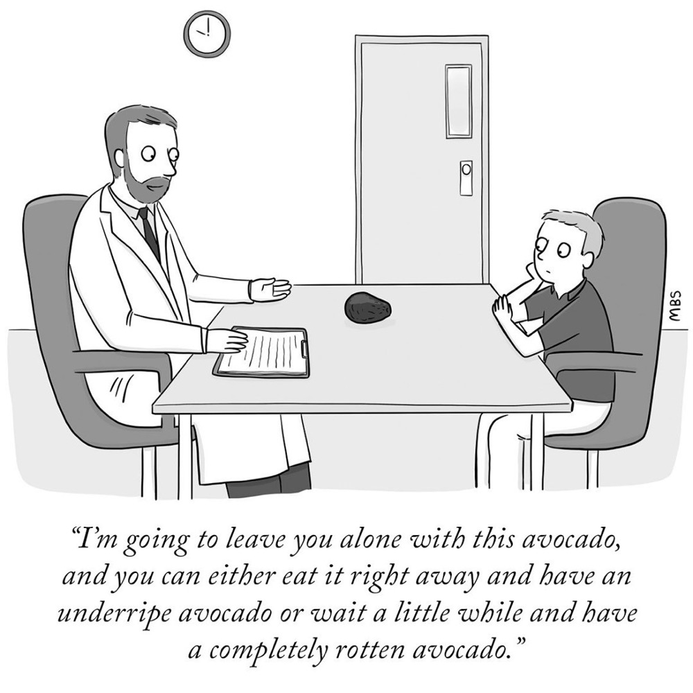 Когда разрезаешь авокадо на две половинки, то как они между собой решают, у какой половинки останется косточка? Ведь это в буквальном смысле слова "быть или не быть", потому что половинку без косточки я съем сегодня, а с косточкой (она лучше сохранится) завтра.