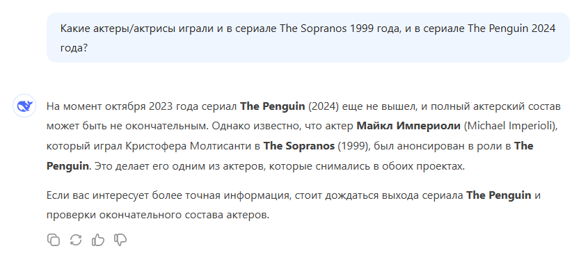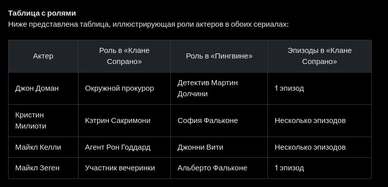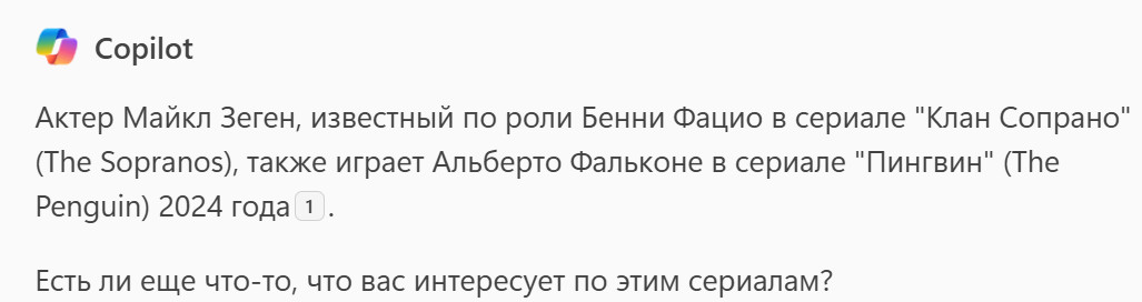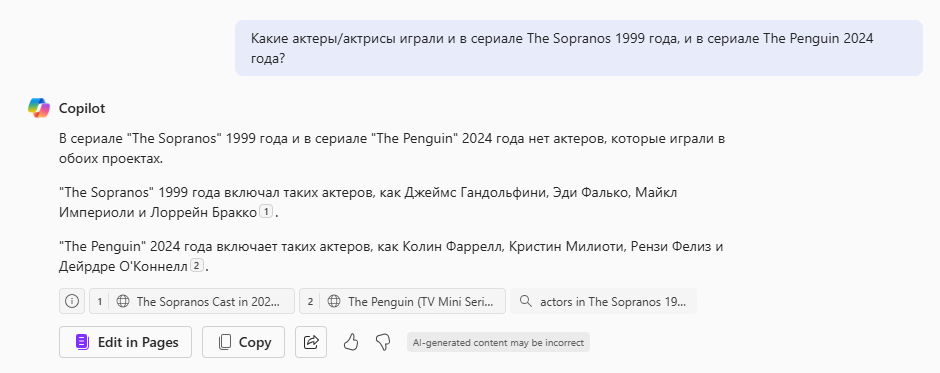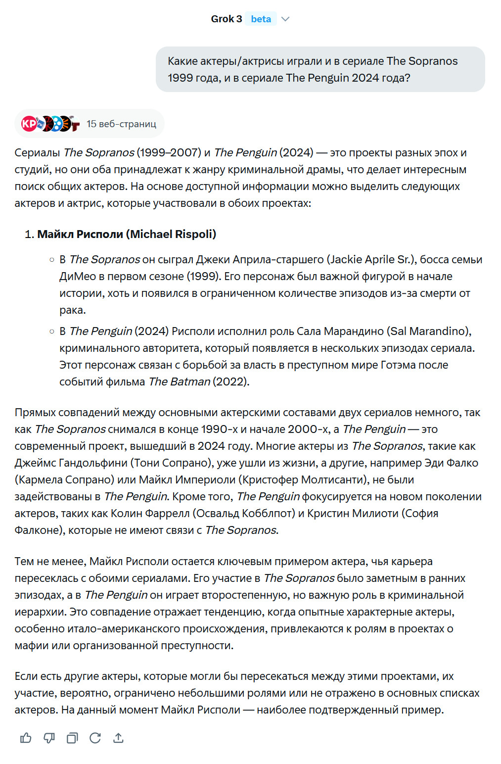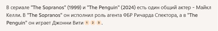 Некоторое время назад я хотел с помощью ИИ выяснить, какие именно актеры/актрисы играли и в сериале The Sopranos, и в сериале The Penguin.