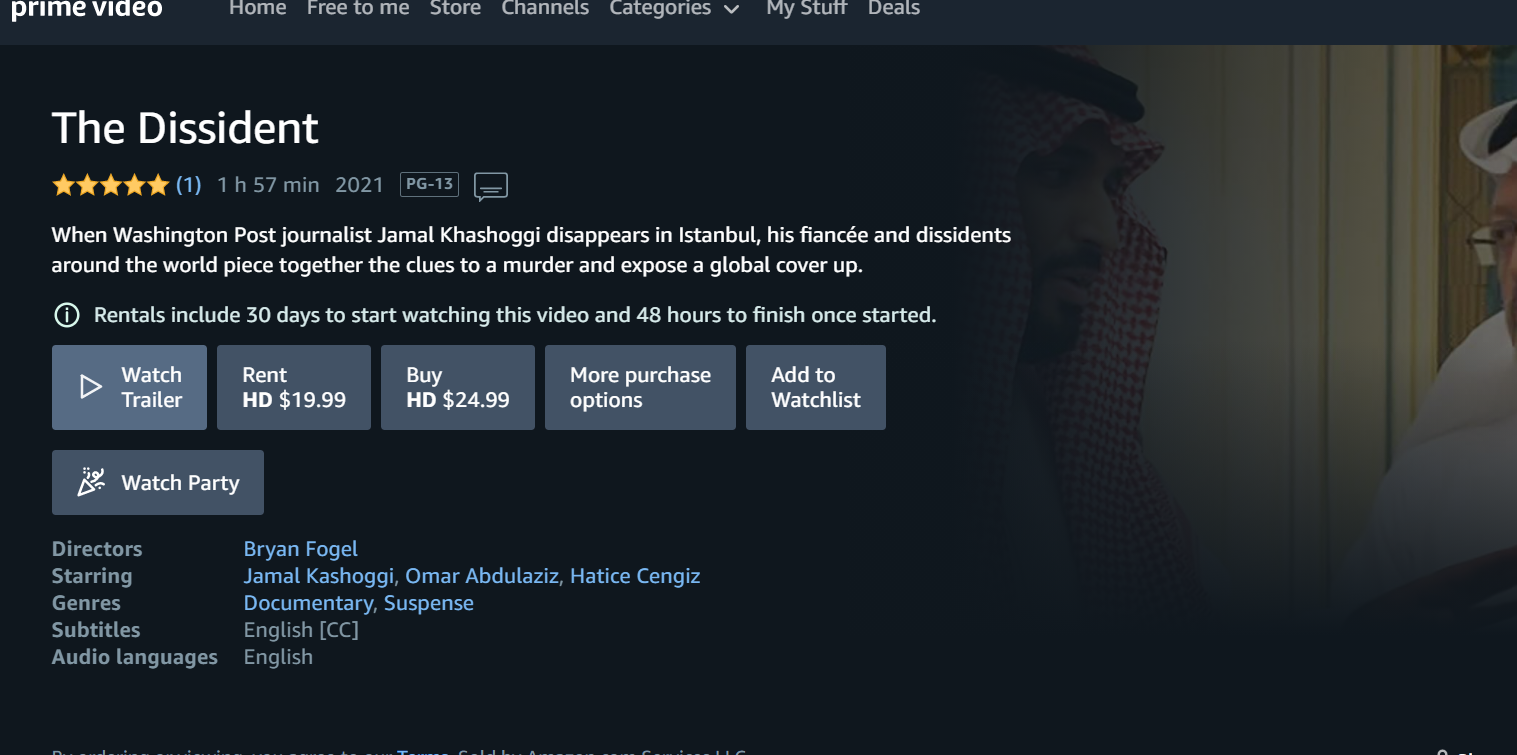"After a two-week run in about 200 theaters (scaled down from 800 due to the pandemic), The Dissident will be available for rent on places like iTunes, Amazon and Roku."