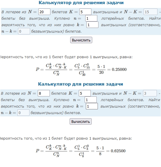 На стол было выложено 20 билетов, вероятность что из них выпал 1-ин выигрышный билет - 0.01717, что 0 выигрышных билетов - 0.00225.