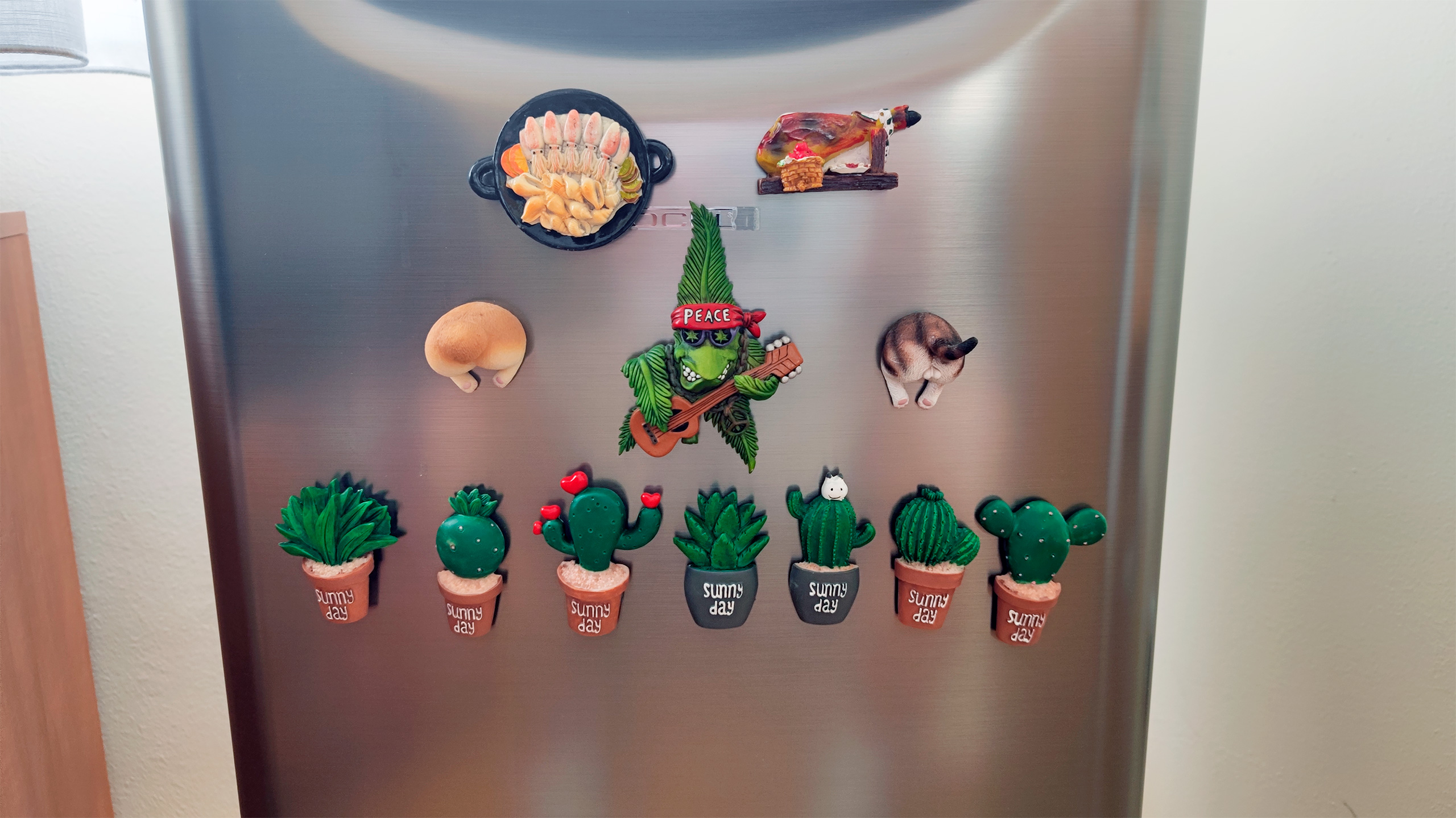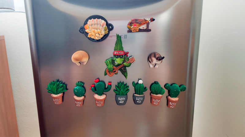 Но я признаюсь в любви к магнитикам на холодильнике, мне все равно нечего терять. Пока коллекция небольшая: паэлья с морепродуктами, хамон на хамонере, конопля с электрогитарой, собачья и кошачья жопки, а также набор боевых кактусов из группы "Солнечный день". Однако коллекция обязательно будет пополняться.