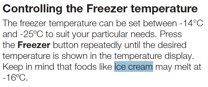 Вы мороженое не покупаете никогда? В инструкции к моему холодильнику Samsung написано, что для хранения мороженого температура должна быть не выше минус 16 градусов Цельсия. Я выставил минус 18, всё путём.