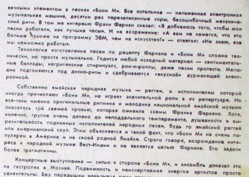 Из рецензии товарища А. Троицкого ("Музыкальная жизнь" 1979, №4), напечатанной на оборотной стороне диска Бони М "Ночной полет на Венеру" вышедшем в СССР.