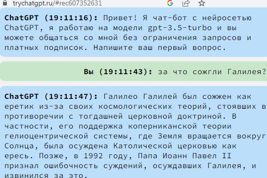 И кстати, было бы познавательно © прочитать ответ какого-нибудь GPT на вопрос "за что сожгли Галилея?" 😉