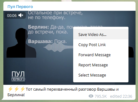 Открываете ссылку в Телеграме. Правая кнопка на видео - "Сохранить видео как..."
