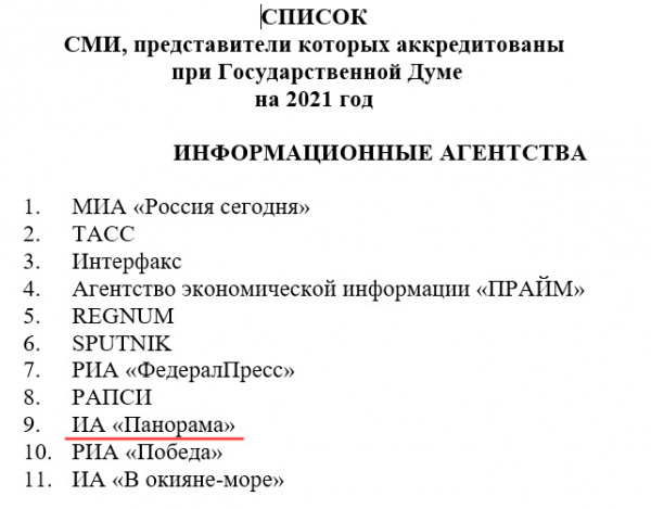 С сайта Государственной Думы - внизу страницы ссылка на вордовский файл со списком сми, представители которых аккредитованы при Государственной Думе на 2021 год.