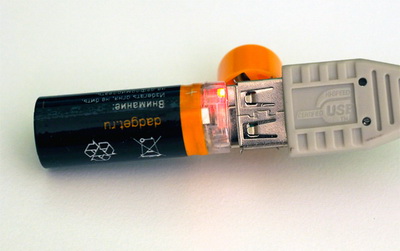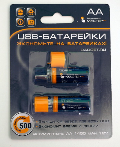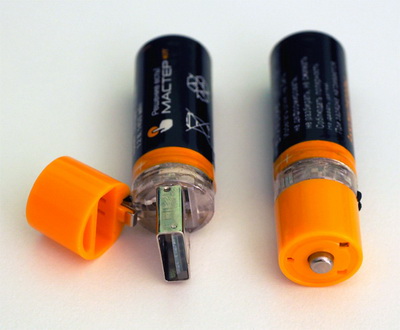 Второй любопытный комплект - аккумуляторы с USB-портом. Я про такие некоторое время назад писал, а теперь наблюдаю их вживую. Ну очень удобно: не надо никаких тебе зарядных устройств, просто воткнул севший аккумулятор в USB-порт - и все дела.