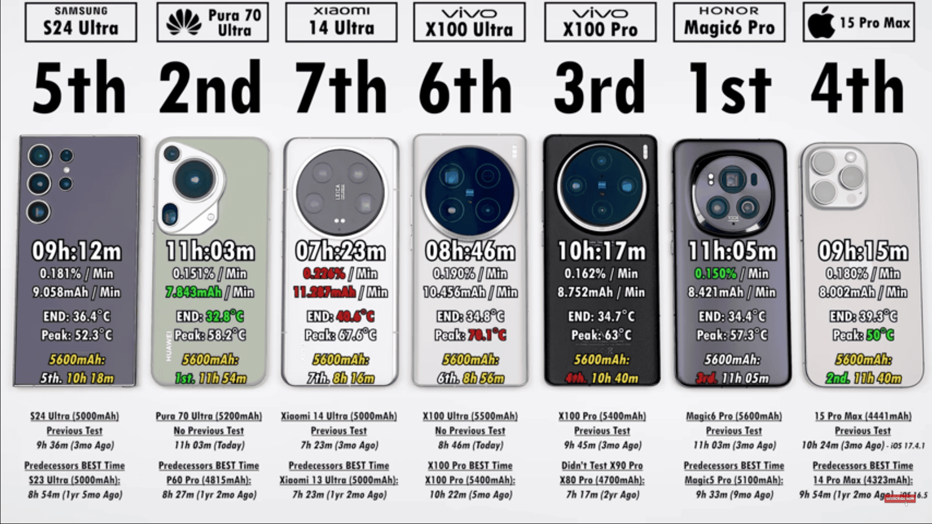 Также блогер экстраполировал полученные данные на все смартфоны из теста, считая, что у них у всех одинаковая емкость аккумулятора в 5600 мАч. В этом случае Huawei Pura 70 Ultra занял первое место, iPhone 15 Pro Max - второе, Vivo X100 Pro - третье.