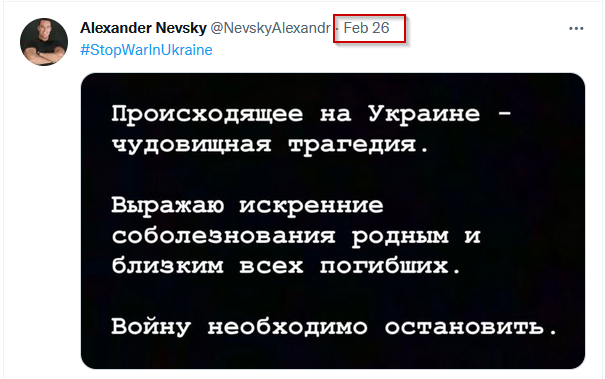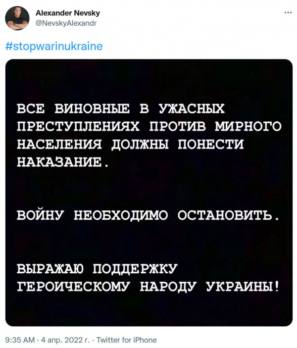 Сегодня в своем Твиттере написал. Несколько неожиданно, если честно, он всегда с этой властью прекрасно сотрудничал. Ну, тем более хорошо, что высказался против этой безумной войны, уважаю.