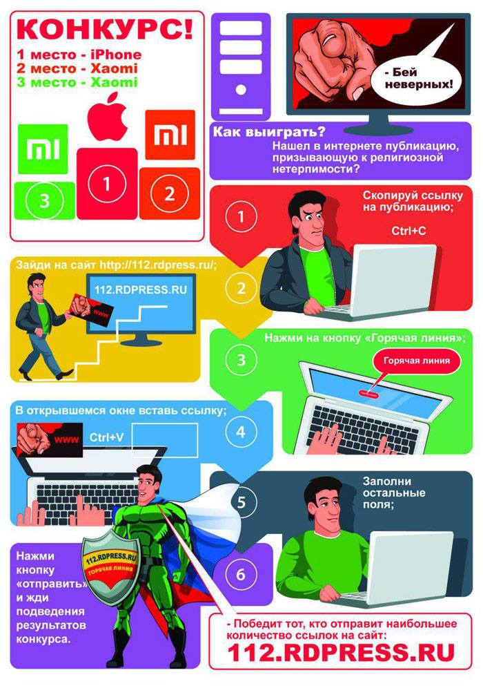 по-моему, пост митрича это классический (клинический) случай, про который говорят - кто о чем, а вшивый все про баню. при чем тут «бей неверных» ??? по ссылке предлагается "Сообщить о пропаганде терроризма и экстремизма в Интернет". Я, лично, трактую это исключительно в контексте возможных террористических актов и прочего насилия.