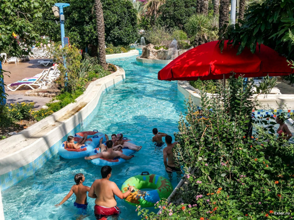 Традиционная "Ленивая речка" - плывешь себе неспешно вокруг всего аквапарка, а тебя периодически обливают водой.