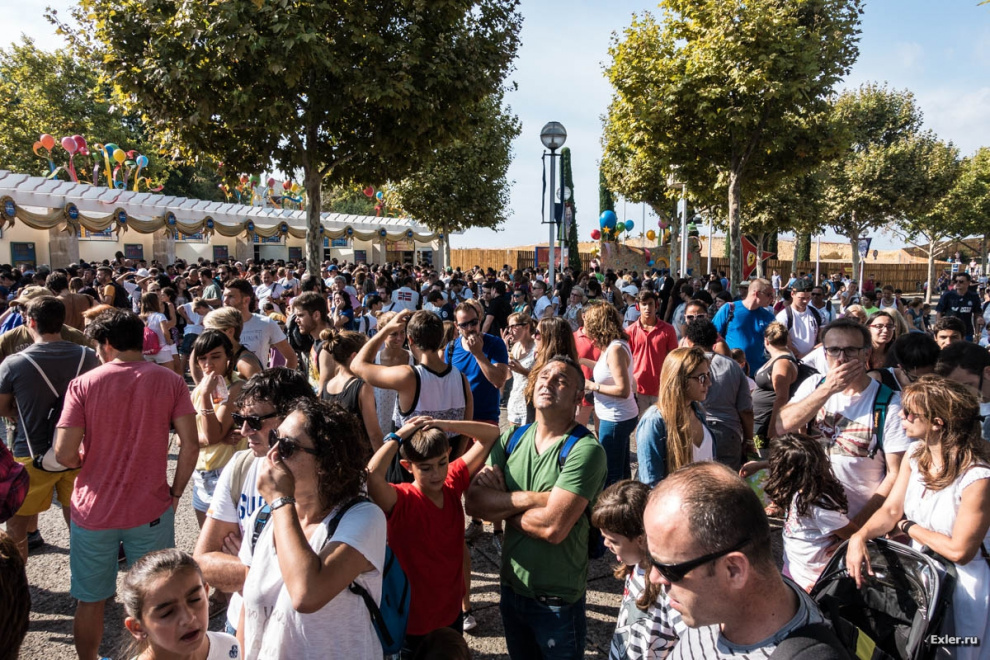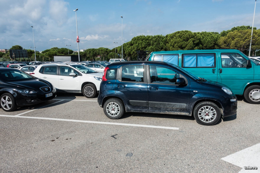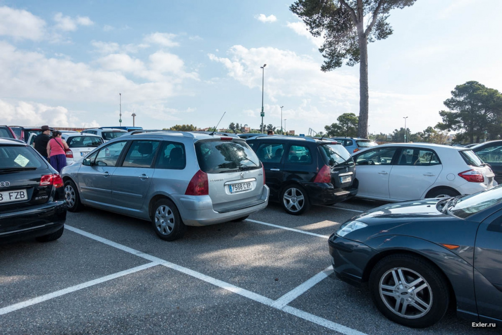 На следующий день приехали в Порт Авентуру пораньше - попали только на дальнюю стоянку и машин уже было полно. Разметка стоянки сделана совершенно негуманно - между рядами машин оставлены очень узкие проезды. При этом нашлось поразительно немало дебилов, которые ставили машины настолько криво, что просто наглухо перекрывали проезд, и это создавало другим водителям очень серьезные проблемы. Вот, например, красавец: от задней линии отстоит метра на полтора и проезд перекрывает наглухо. Ну как можно быть таким уродом?