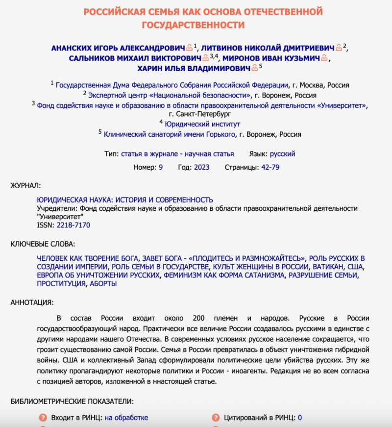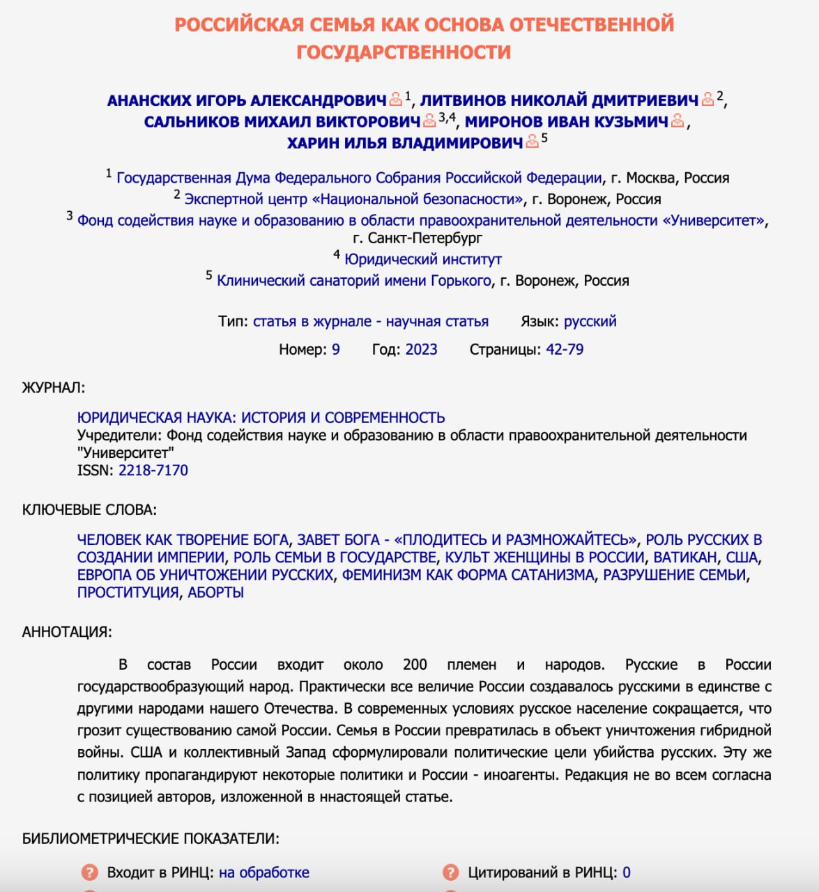 В ТГ "КРИНЖ" внимательно изучили научную статью под названием "Российская семья как основа российской государственности". К этой статье приложили руки многие светочи отечественной науки и Государственной Думы.