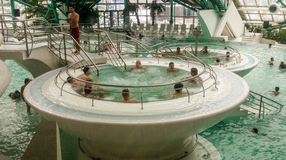 Основной комплекс под огромным стеклянным куполом выглядит вот так: здоровенный бассейн, из которого можно подняться в несколько больших круглых ванн с гидромассажем.