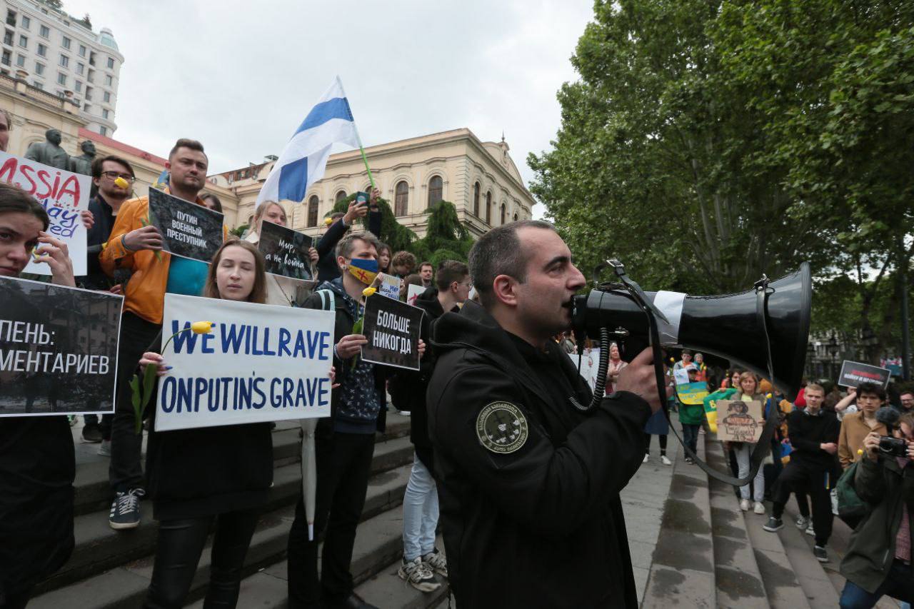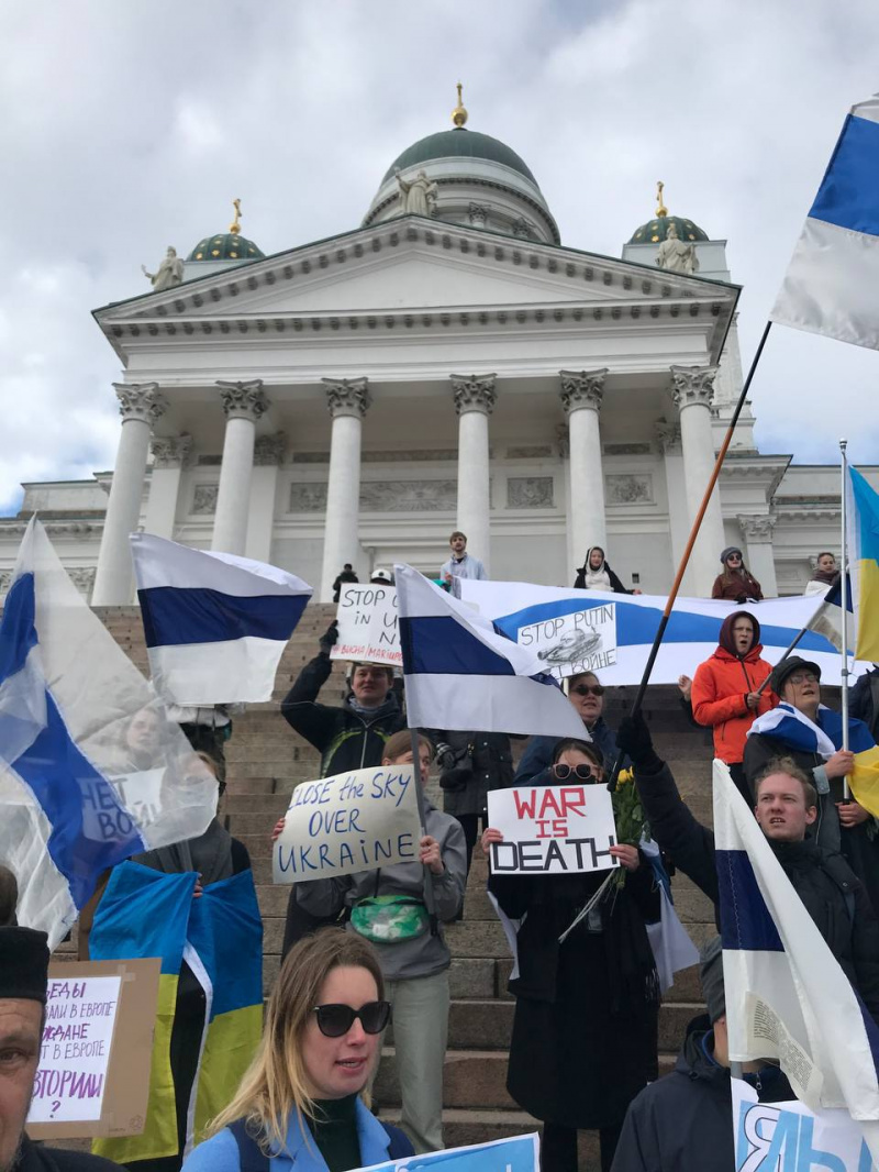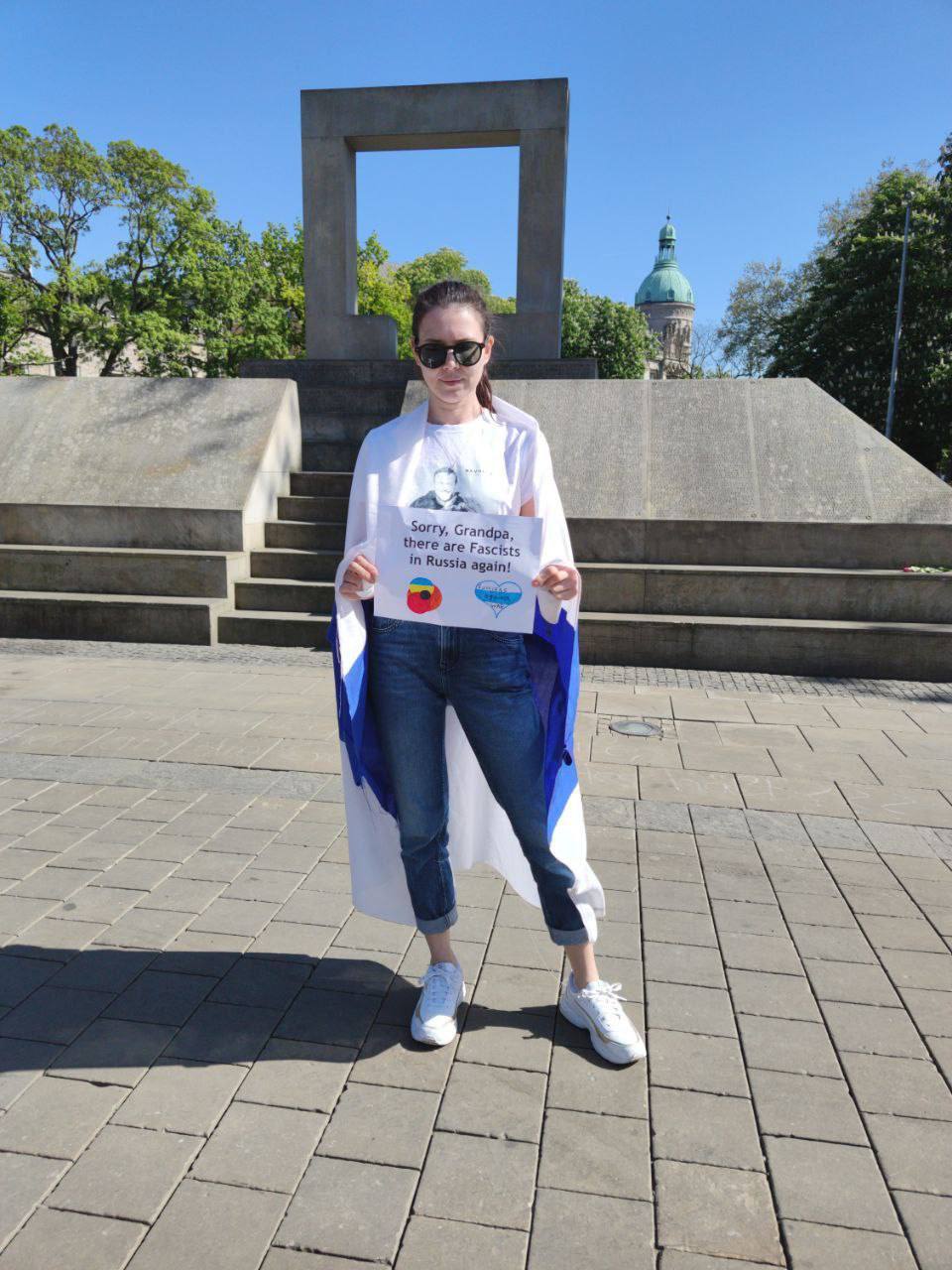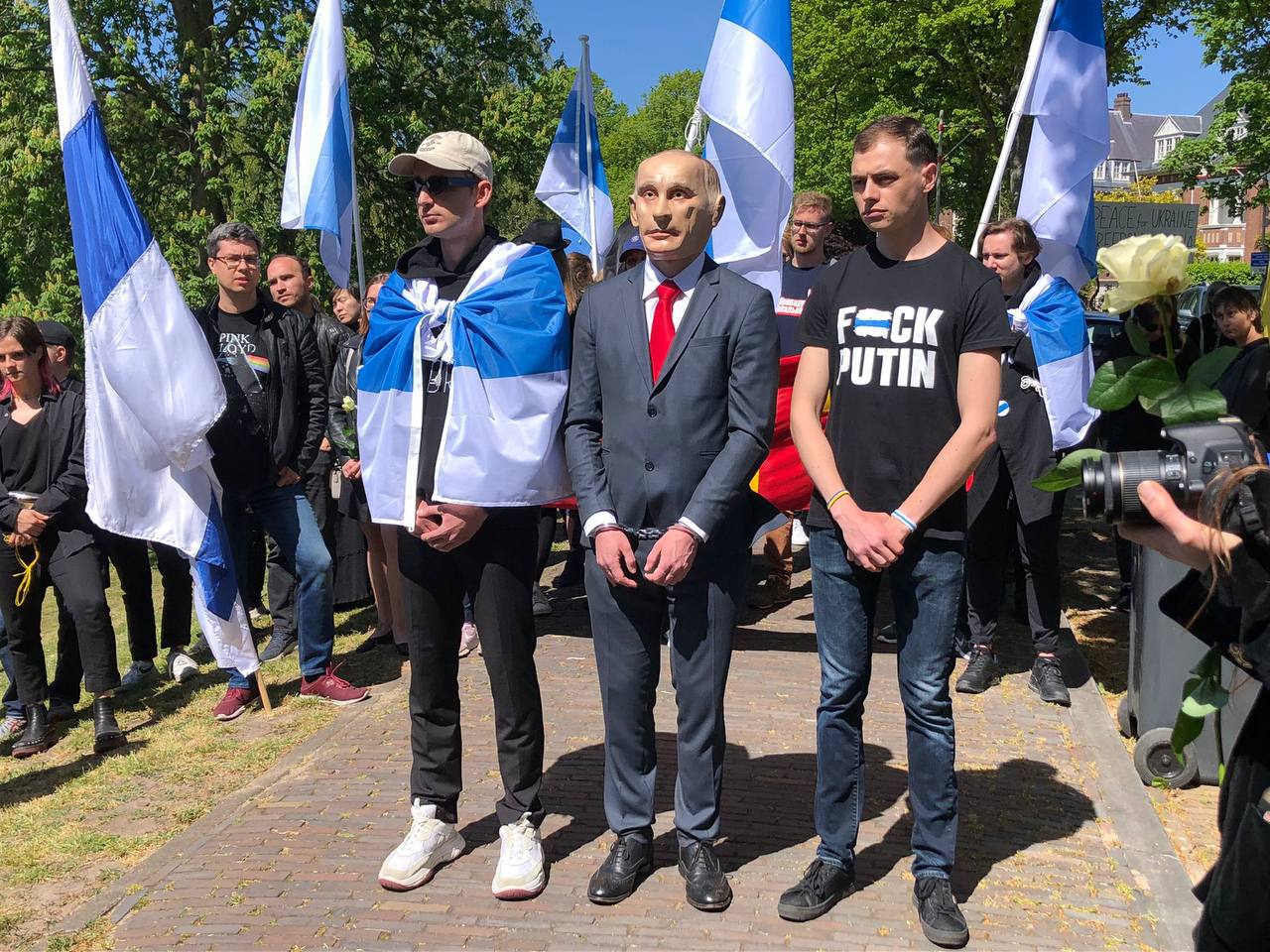 Вчера, 8 мая, в различных городах Европы проходили антивоенные акции. В них участвовали украинцы с украинскими флагами и россияне под бело-голубым российским флагом (российский флаг без крови). (Отсюда.)