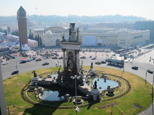 Сверху можно чудесно пофотографировать. Вот монумент на Площади Испании, левее - выставочный центр, где сейчас MWC 2012.