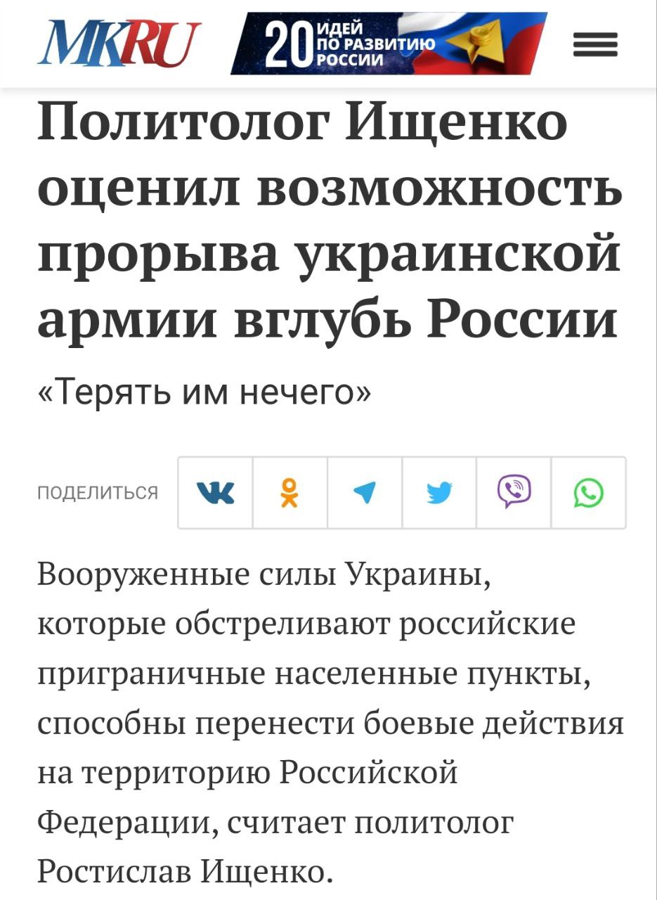 "ВСУ могут воспользоваться ситуацией и создать группировку в 20-30 тысяч человек, которая начала бы движение прямо на Москву. Из-за эффекта внезапности за одну ночь вполне можно ворваться в Белгород, Курск, Орел или Брянск. За 7-8 часов колонна военной техники, если она пересечет границу в районе Глухова, дойдет до столицы при скорости 70 километров в час. Части ВСУ могут даже перерезать несколько стратегических шоссе - от смоленского до рязанского, после чего выйти к МКАДу и даже проскочить до Кремля.