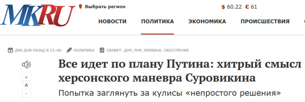 А еще из этой серии имеет смысл поржать вот над такой статейкой в МК, в которой объясняется, что это все - такой хитрый план Путина. Прямо-таки скажем, иезуитски хитрый план Путина и блистательный манёвр Суровикина-Шойгу-Кутузова. Кутузов же оставил Москву? Оставил. Ну и фигли вы ржете тогда?