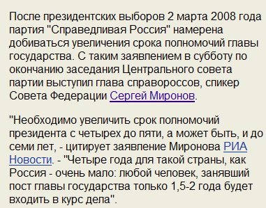 То есть товарисч Миронов агитирует за то, чтобы будущий премьер-президент Путин снова стал президентом после будущего президента-премьера Медведева на 1-3 пять лет позже, чем это сейчас планируется? Интересно, под чью западную дудку он выпевает эту крамолу? Совсем нюх потерял главный справорос. Нехорошо!