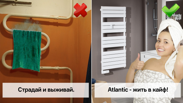 Полотенцесушители Atlantic меняют сознание потребителя. Уводят от советских – к цивилизованным современным европейским технологиям. Круглый год в вашей ванной – полотенцесушитель Atlantic с итальянским дизайном, а не совковая облезлая «змейка». Каждый день вы принимаете душ в прогретой ванной, а не дрожите от холода, как только выключаете воду. Каждый день вы знаете, что мокрое полотенце высохнет за два часа, а не будет сыреть сутки и распространять неприятный запах. Полотенцесушители Atlantic с «полным фаршем» современных французских технологий создают ваш личный комфорт в ванной и повышают уровень жизни.
