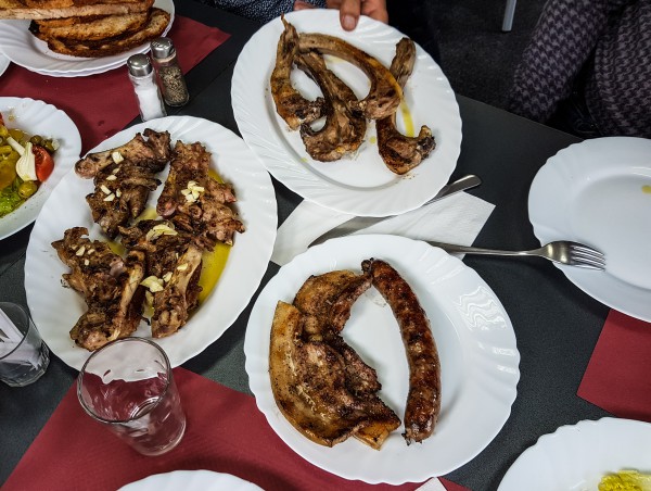 То же меню примерное, та же картошка (один в один!), почти такой же салат, такие же антрекоты (в Греции их называют бризоллы), такие же колбаски (луканико), такие же рёбрышки, такой же жаренный хлеб в плетённой корзинке. Разве вино чаще белое, чем красное, как мне показалось. И наливают его не в порроны, а специальные греческие медные кувшины для вина, реже стеклянные.