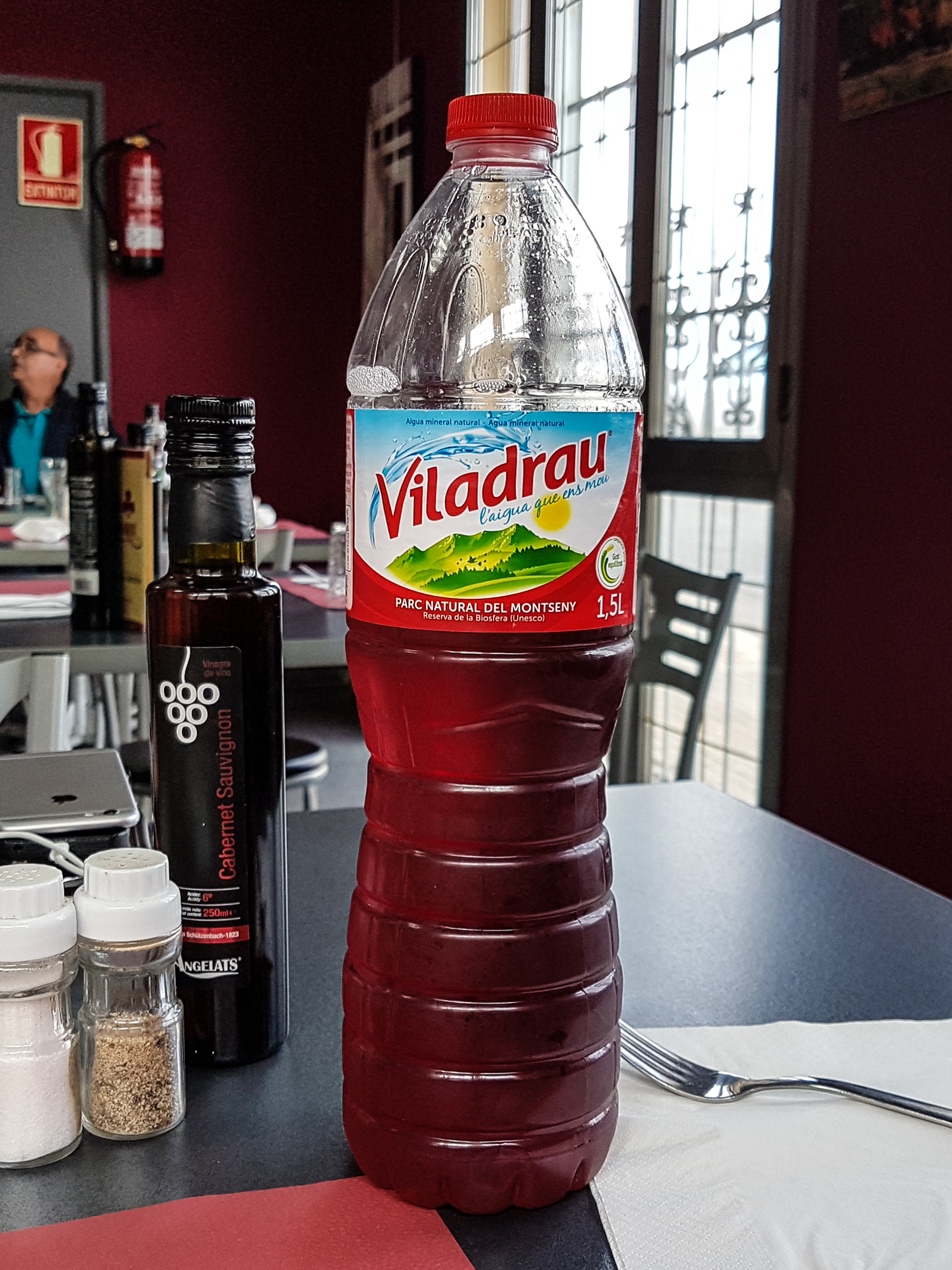 Какое вино мы будем пить? Разумеется, их собственное, настоящее vino de casa - они его сами делают. Вино стоит в бочках, в бутылки его вообще не разливают: для посетителей наливают в каталанский стеклянный сосуд под названием поррон, а чтобы туда доливать вино - приносят его в обычной пластиковой бутылке из-под воды. Винцо, кстати, довольно приличное, хотя и молодое.