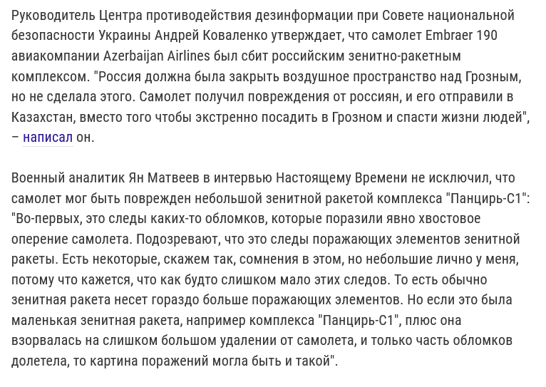 Есть один любопытный нюанс. По правилам ИКАО комиссия для расследования состоит из представителей стран: производителя самолета (Бразилия), владельца (Азербайджан) и страны, где призошла авария (по официальной версии Казахстан). Без представителя РФ. Уверен, что РФ примет все меры, чтобы расследовало не ИКАО, а ее карманный МАК, который примет любую устраивающую Путина версию.