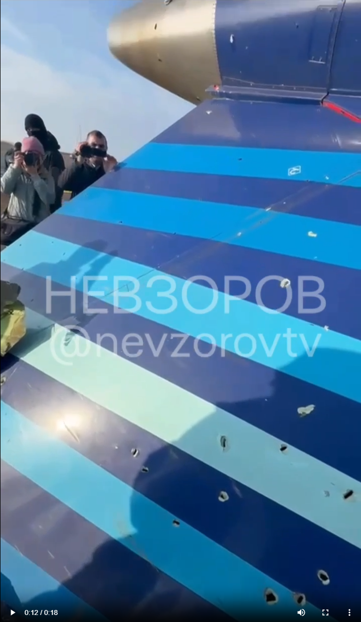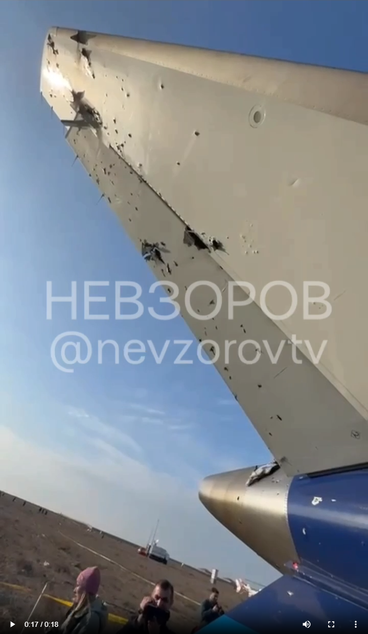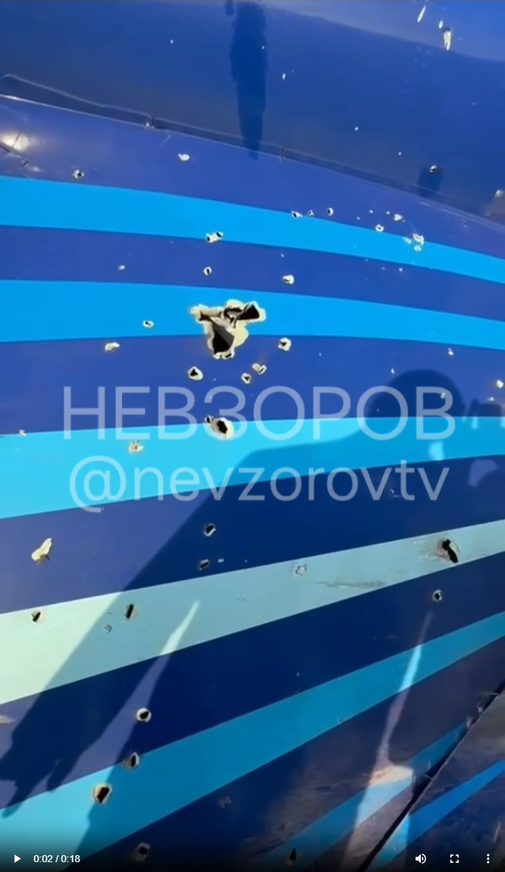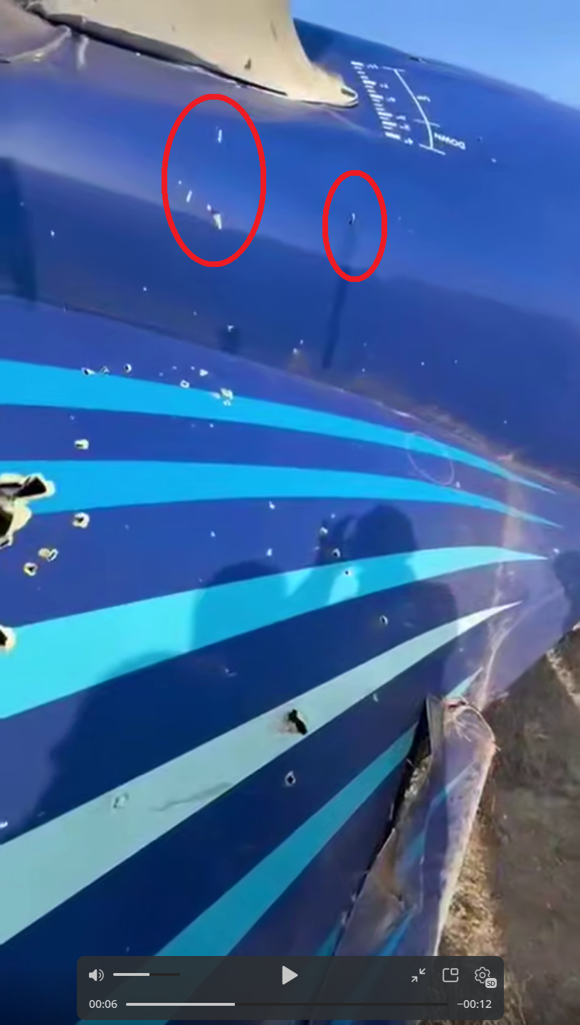 В общем окончательный, и довольно очевидный вердикт: "Панцирь" - у него зона поражения как раз близко от цели сзади, взрыв как минимум один (возможно - два), слева от хвоста (белая плоскость на видео - не вертикальная, а горизонтальная часть хвостового оперения, вертикальная - синяя, в нее поражающие элементы вошли почти перпендикулярно, в горизонтальную - под очень острым углом). Довольно точное направление взрыва можно определить по следам от поражающих элементов, которые прошли параллельно обшивки хвостовой части фюзеляжа и оставили на нем царапины или рваные поыреждения (на первом скрине). На уже опубликованных видео также хорошо видно, что вертикальная плоскость хвостового оперения была прошита насквозь, были повреждения левого крыла и внутри салона, включая ранение минимум одной пассажирки. Журналистам, кстати, уже запрещают брать интервью у выживших.