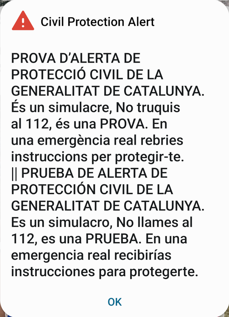 Сегодня в 10 утра в нашем регионе, как потом выяснилось, каталонская Гражданская оборона тестировала систему экстренных оповещений в чрезвычайных ситуациях. Система сработала исправно: смартфон начал истошно визжать совершенно незнакомым и пугающим звуком, одновременно выдав на экран сообщение об опасности. Впрочем, в сообщение было написано, что не надо хватать бриллианты и куда-то бежать, так как это просто тестовая проверка.