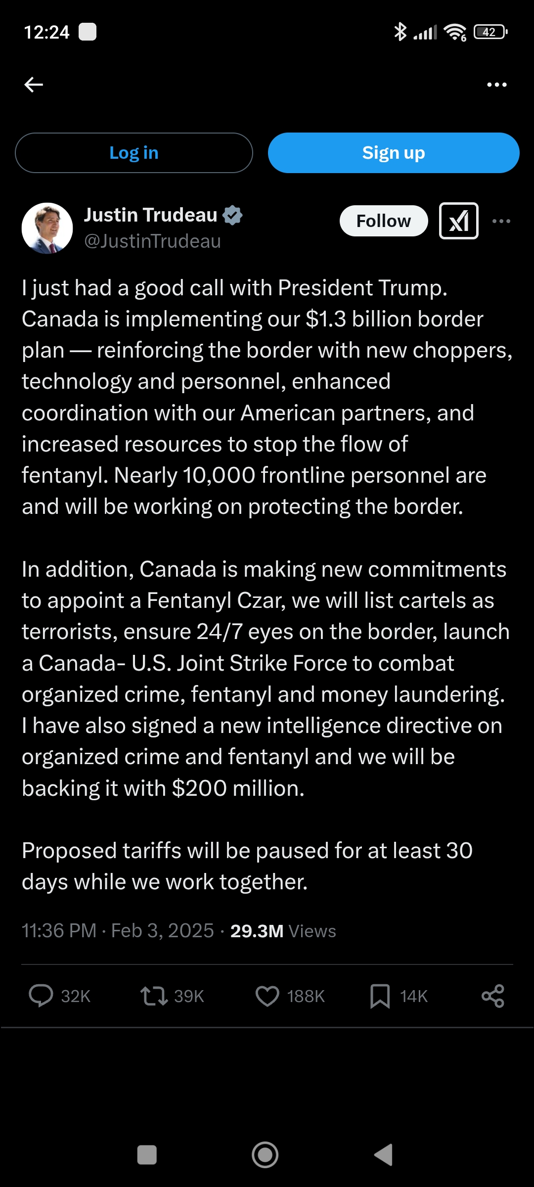 За несколько часов до вступления в силу тарифов, которые бы попросту взорвали экономику Канады, премьер-министр Канады согласился на ряд чувствительных мер, на которых настаивает Трамп.