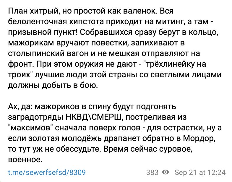 Те жалкие тысячи человек, которые хотели воевать, за идею или за деньги - уже там. Сейчас будут отправлять сотни тысяч тех, кто уж точно воевать не хочет. Ну ок. Тогда за спиной нужны заградотряды в товарном количестве и угрозы посадить членов семей в случае сдачи в плен.
