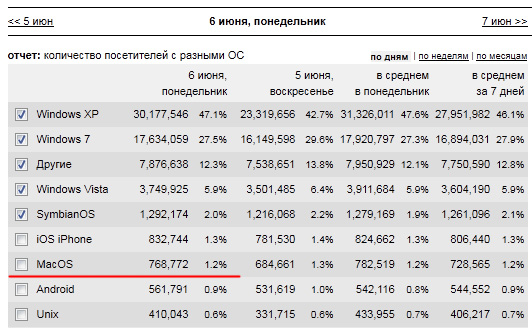 Я можт чего не понимаю. В табличке показаны ОС, а не браузеры. Что, нет сафари под винду или оперы под iOS? Причем тут доля макоси 1.2%?