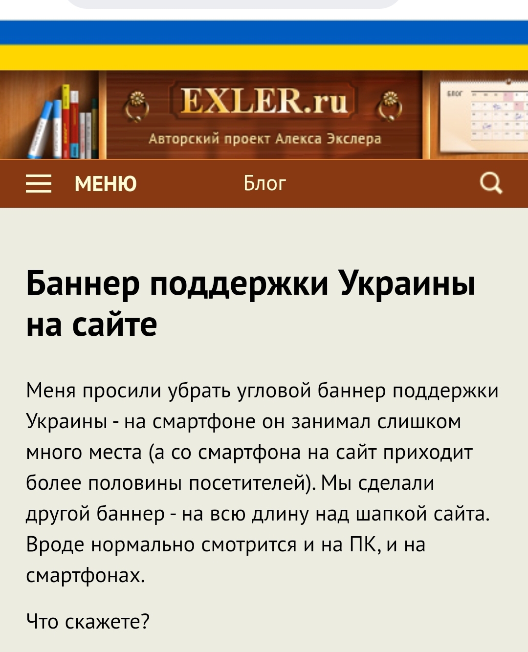 Меня просили убрать угловой баннер поддержки Украины - на смартфоне он занимал слишком много места (а со смартфона на сайт приходит более половины посетителей). Мы сделали другой баннер - на всю длину над шапкой сайта. Вроде нормально смотрится и на ПК, и на смартфонах.