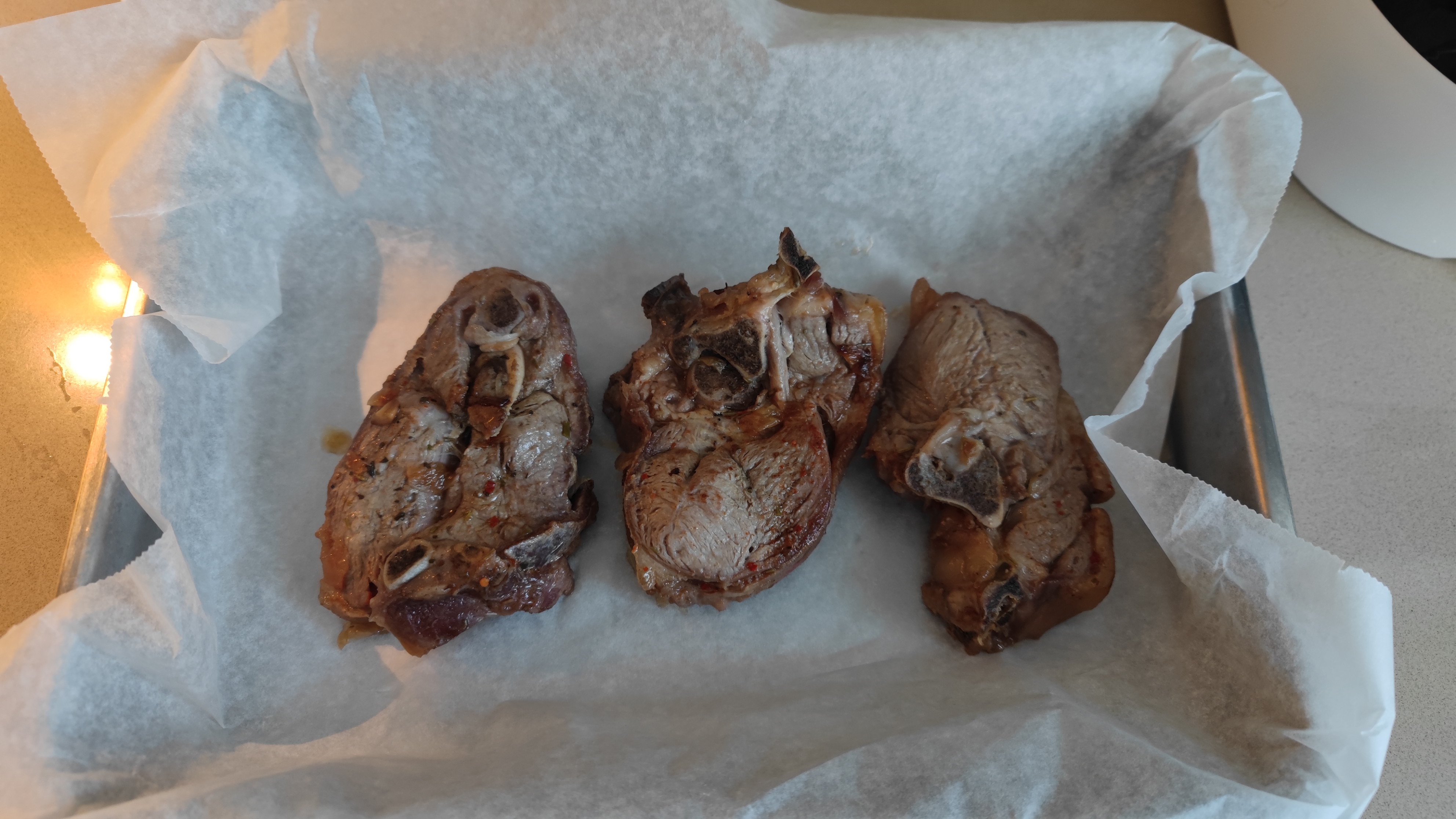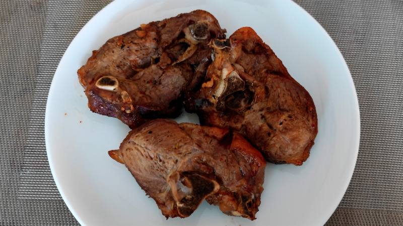 В общем, взял баранью лопатку, попросил, как обычно, порубить на кусочки толщиной сантиметра в два. Бараньи ребра я давно перестал покупать. Во-первых, дорогущие, а мяса там мало, одни кости, а, во-вторых, с ними все время лотерея: иногда попадаются очень вкусные, но нередко - прям совсем никакие, выброшенные деньги. С лопаткой же качество обычно достаточно стабильное.
