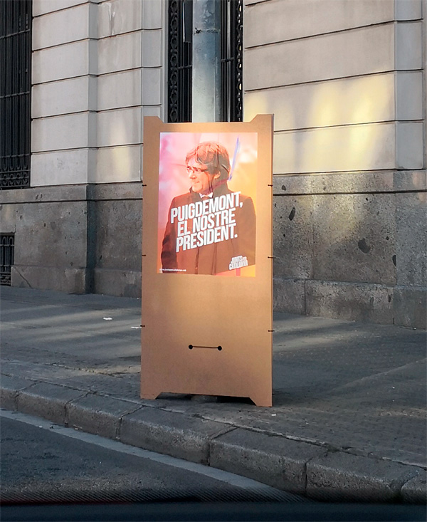 Самопальный плакат с надписью "Пучдемон, наш президент". Нашему президенту тут же пририсовали веревку на шею и прицел на лоб. Уровень гражданского согласия в Каталонии сейчас чрезвычайно высок.