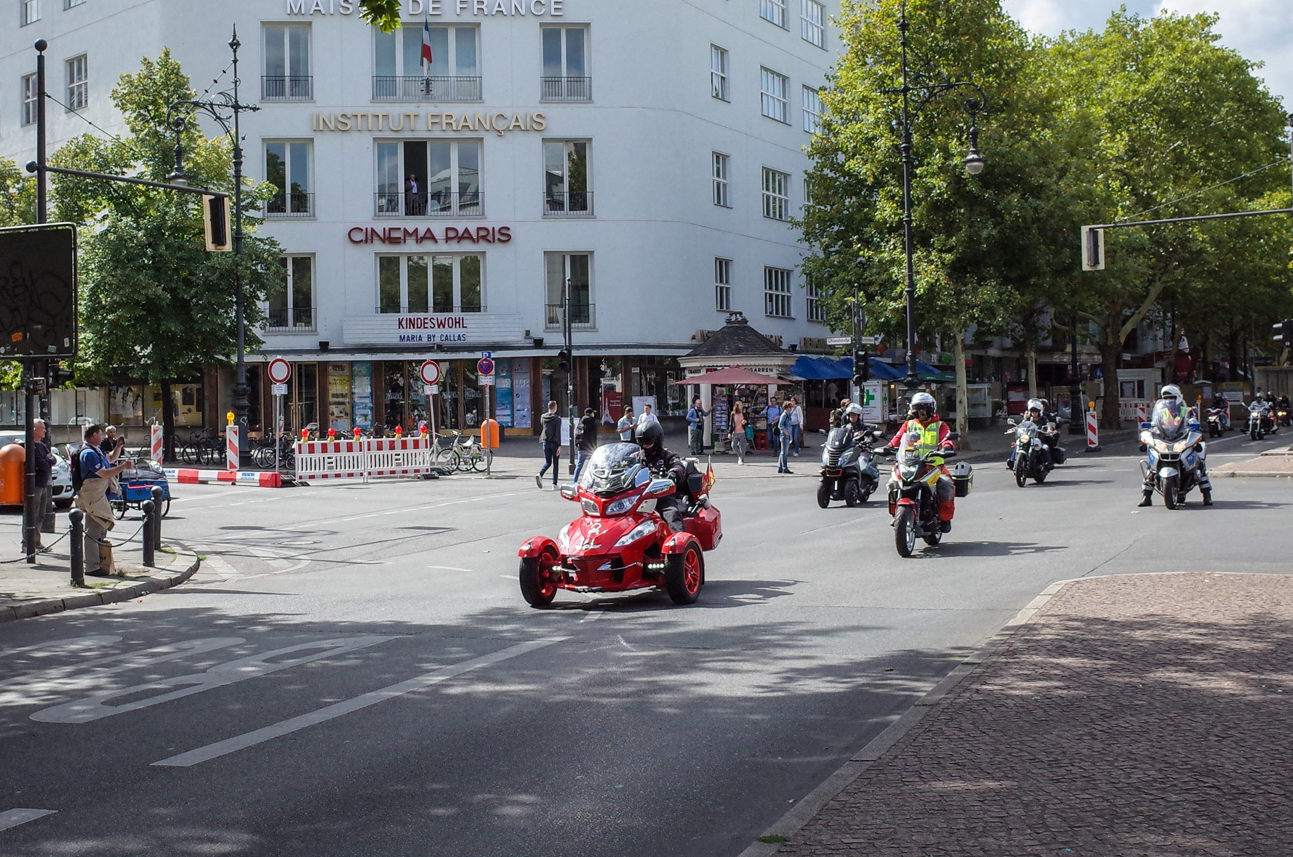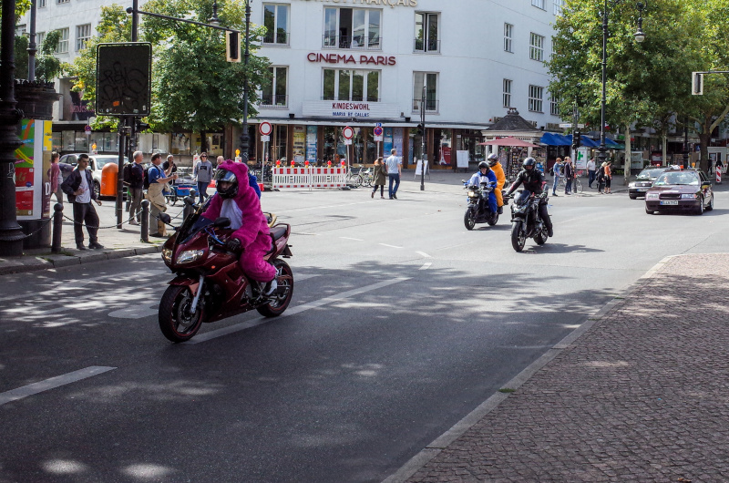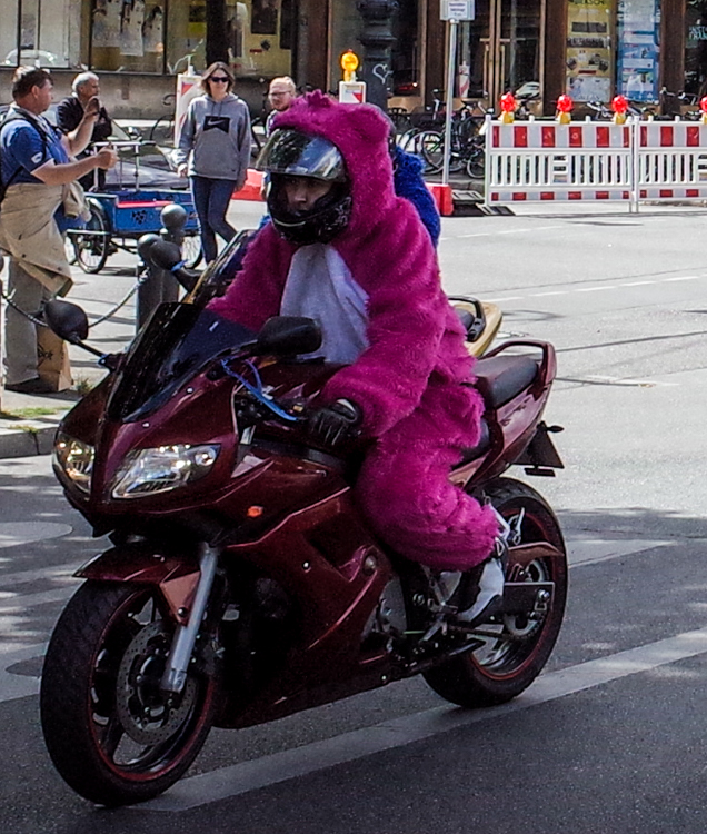 Собираюсь перейти дорогу, вдруг смотрю - полиция едет и в громкоговоритель о чем-то предупреждает. А за полицией - байкеры сплошной толпой. Причем реально толпа - они ехали минут десять, не меньше. И там были и очень колоритные мотоциклы, и очень колоритные байкеры.