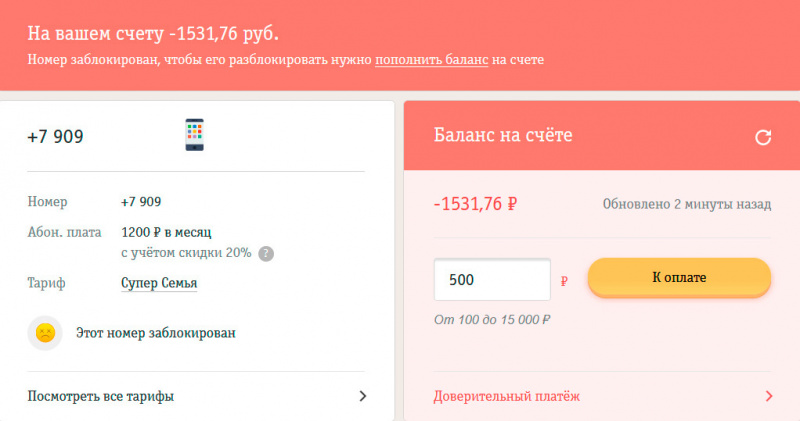 Я сразу полез в ее личный кабинет и там обнаружил вот такую разлюли-малину. Тариф изменен на "Супер Семья" с безлимитным Интернетом (для кнопочного телефона это особенно актуально) за 1200 рублей в месяц, ну и еще задолженность висит в 1531 рубль - красота!