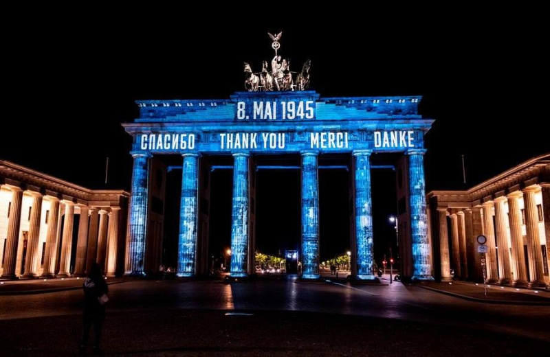 Берлин, в день окончания Второй мировой войны (весь мир отмечает его 8 мая) на Бранденбургских воротах высветили слово "спасибо" - как пишут, на семи языках.