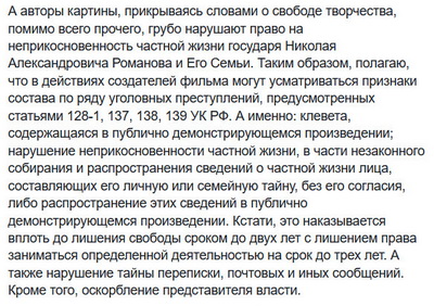 «Если выйдет фильм "Матильда", кинотеатры будут гореть, может, даже пострадают люди. Официально уведомляем: любой баннер, афиша, листовка с информацией о прокате фильма будет рассмотрена как желание унизить святых православной церкви и провокация к "русскому майдану"», — говорится в заявлении. (Отсюда.)