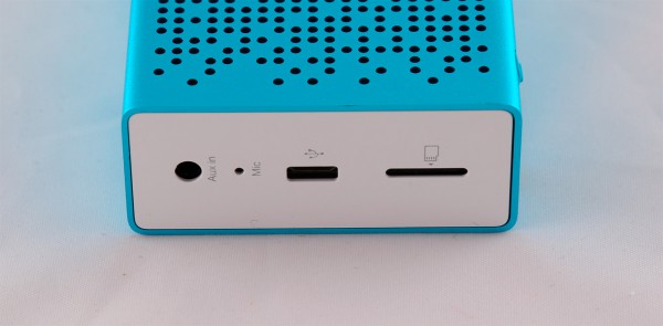 На левом торце - аудиовход под проводное подключение источника, микрофон (колонка может работать как гарнитура), порт microUSB для зарядки аккумулятора, слот для карты памяти microSD.