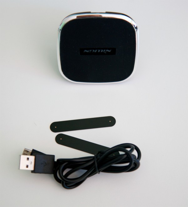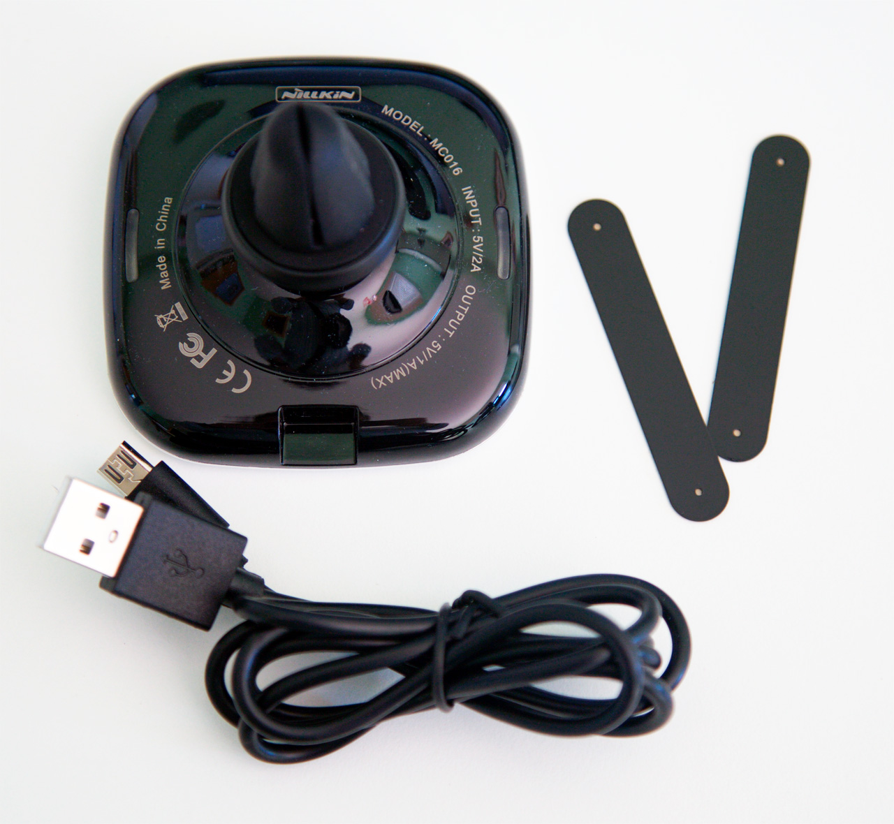 Комплектация - зарядка-крэдл, кабель USB-microUSB, две магнитных полоски с липкой лентой на одной стороне.