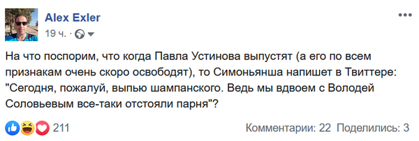 Впрочем, слова благодарности силовикам Соловьев обратно не взял, и в своем телеэфире за жертву их безупречной вежливости и грамотности не вступился. Ограничился твиттером. Но будьте уверены, непременно отметит свои заслуги, как только приговор Устинову будет пересмотрен или вовсе отменен.