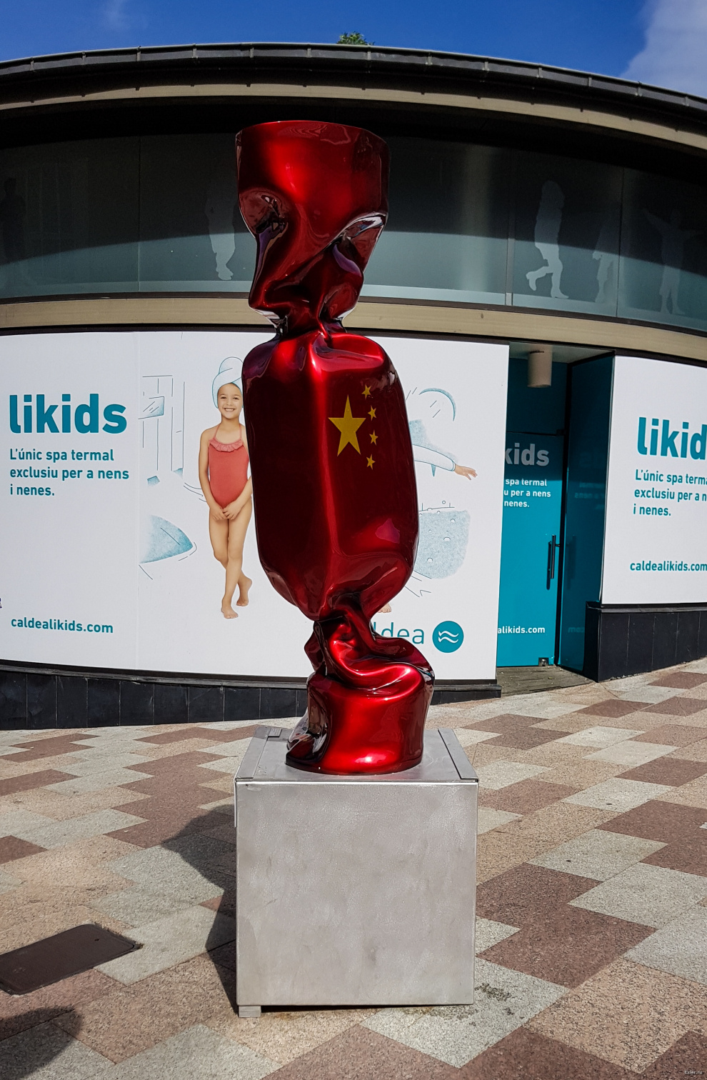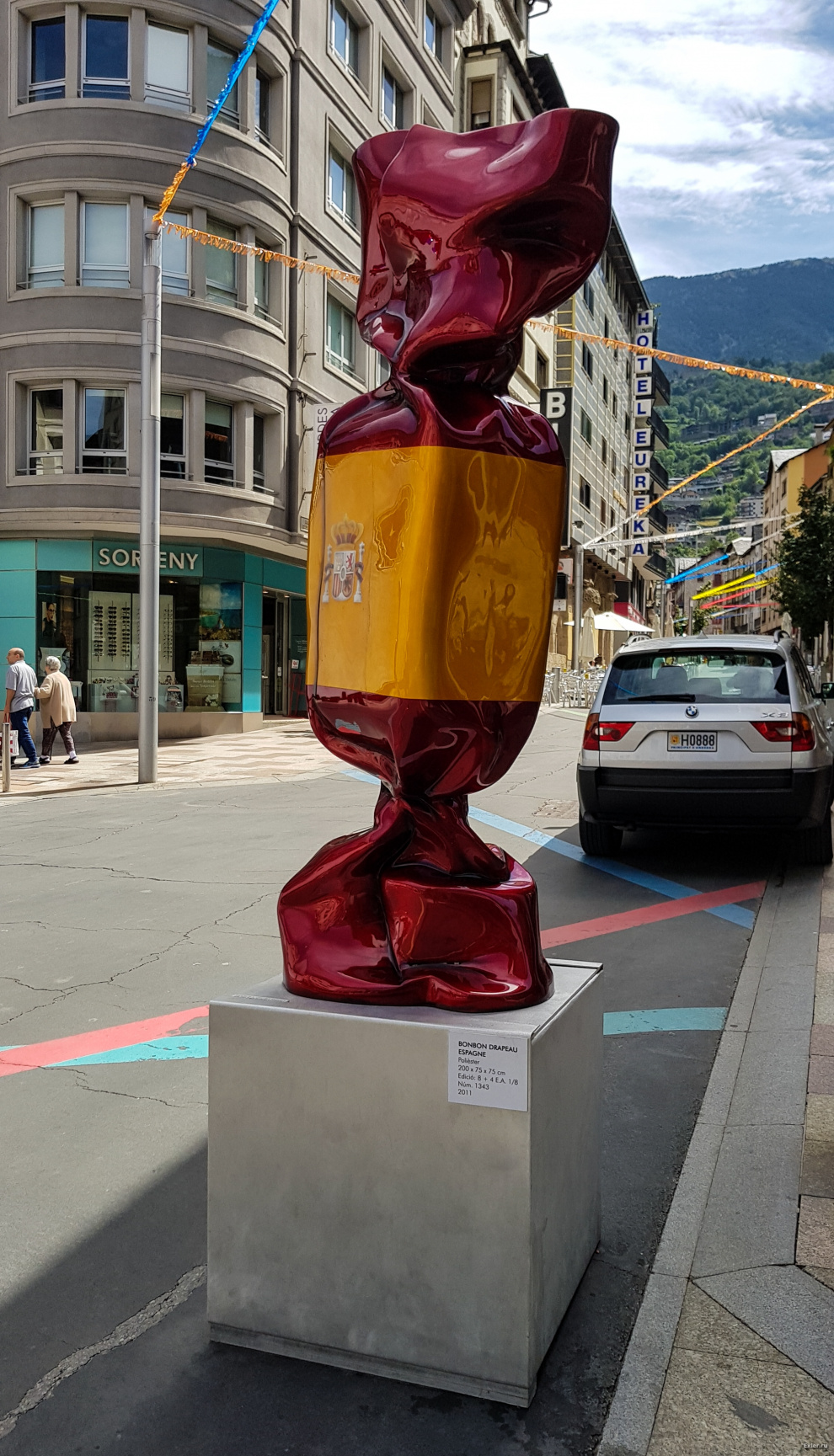 На главной улице выставлены вот такие скульптурки конфет, раскрашенные в цвета флагов разных стран.