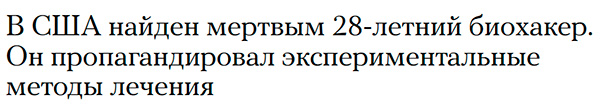 Не знаю ни одного небиохакера, умершего в 28 лет в ванной не от утопления или другого несчастного случая. Этот самопальные прививки от герпеса себе колол, другие биохакеры взламывают свой организм "крокодилом" и прочими химическими соединениями.