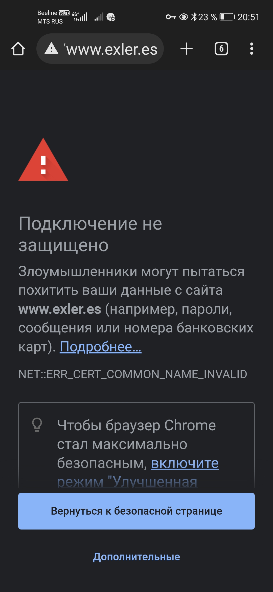 У меня exler.es сразу перенаправляет на exler.ruПотому всё работает.exler.me имеет свой собственный сертификат