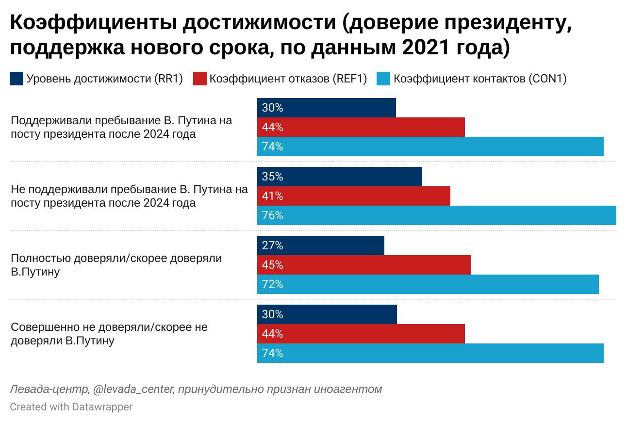 Как мило... Я прям смеялся... Погодите, репрессии в россии начались с 19 года, после отравления Навального. Не такие как развернулись в 22 году, но тем не менее вполне себе. Т.е. люди уже и посидеть успели и понимали что риски есть определенные. Но исследователи так и не показали/или не опровергли что в 21 году сторонники Путина не отвечали более охотно. Т.е. нет уверенности что в 21 году были честные ответы...