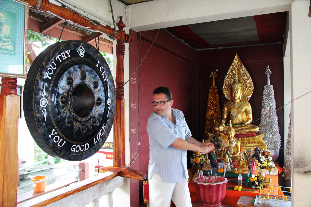 Вокруг статуи идет галерея с медными колоколами. Там можно взять специальную колотушку и легонечко треснуть по колоколу. Считается, что чем громче звук, тем лучше у человека карма. У меня она, судя по всему, офигенная - звон был слышен аж в Бангкоке.